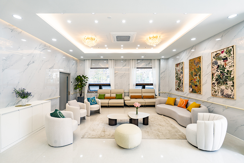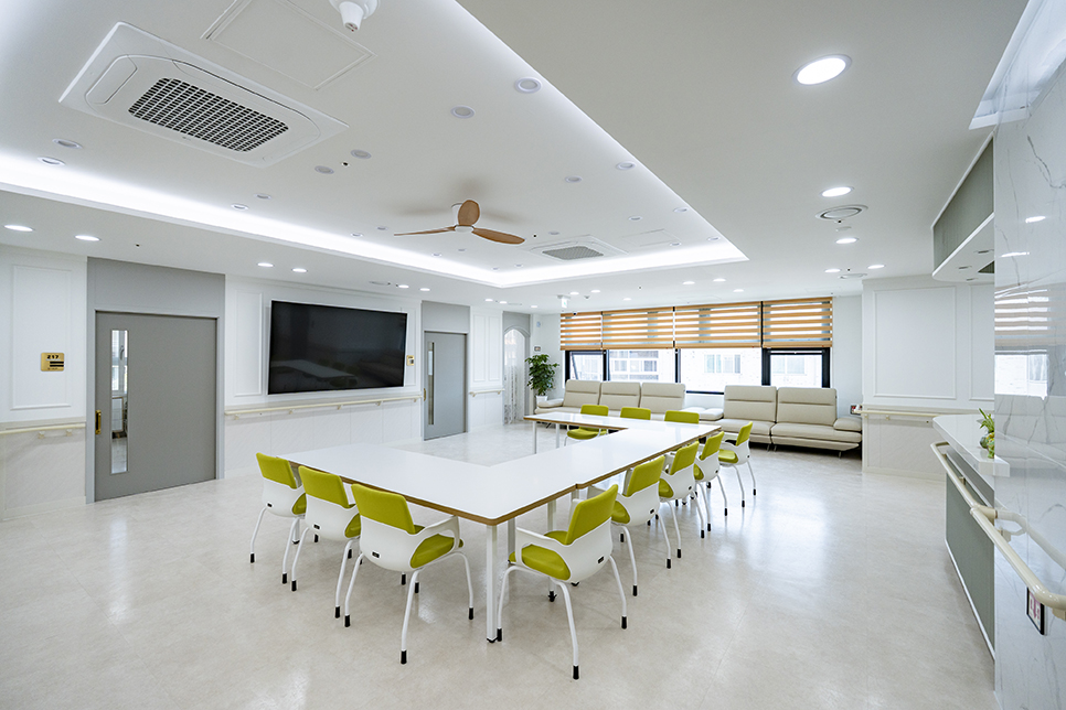 방문객과 입소자분이 편안히 머무실 수 있는 넓고 밝은 공용 공간입니다.